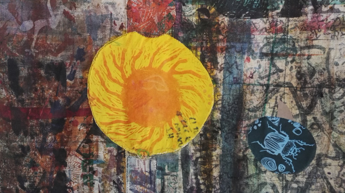 Painopohjalle ommeltu puupiirrokseni ja eteläafrikkalainen ötökkätilkku.