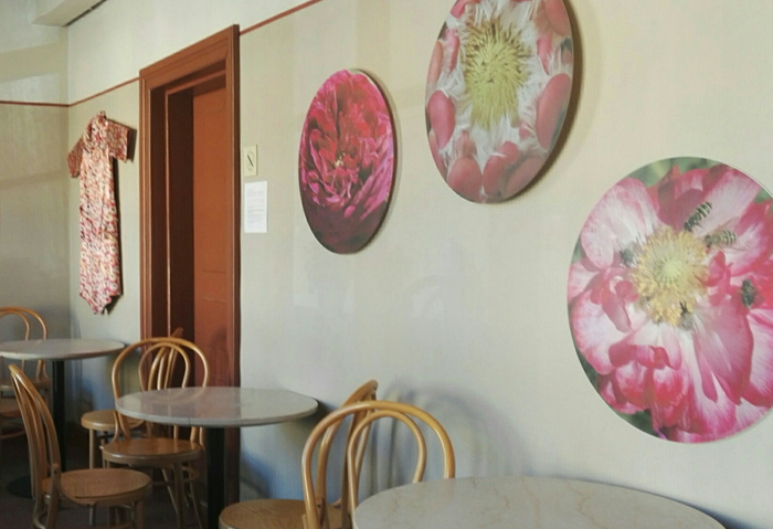 Alma-mummon aamutakki, joka on kiertänyt äitini kautta minulle (vasemmalla) ja kukkaympyröitä sarjasta Kukkii 2014-, valokuvat pleksille.
